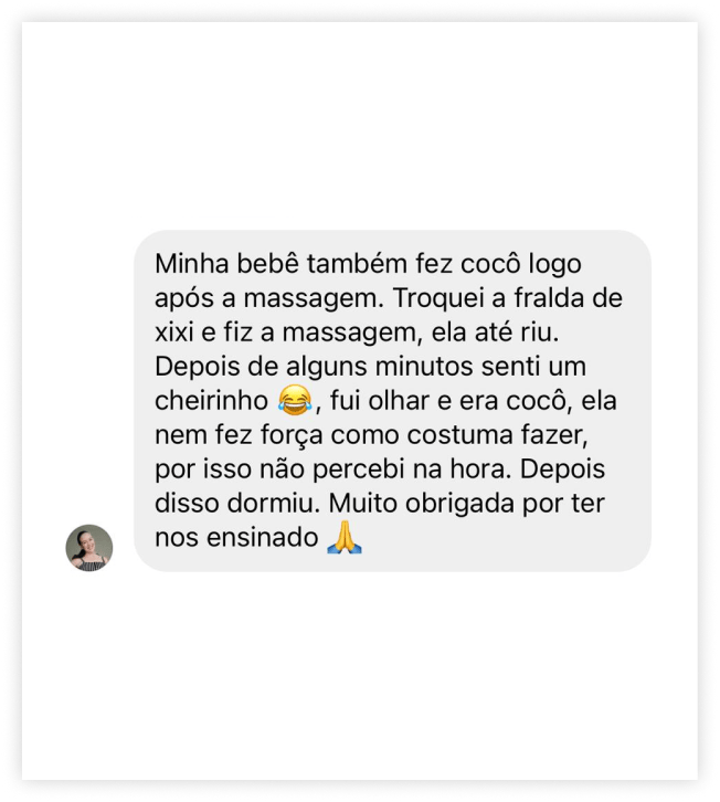 “Fiz a massagem ensinada no curso e ela fez tanto cocô que chegou a vazar na fraldinha.“